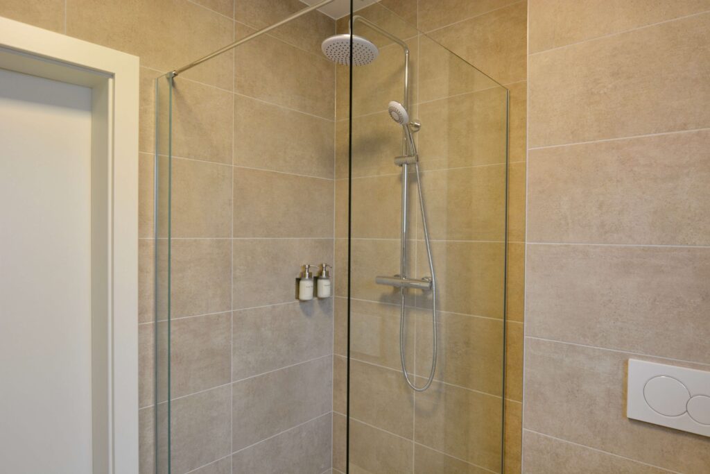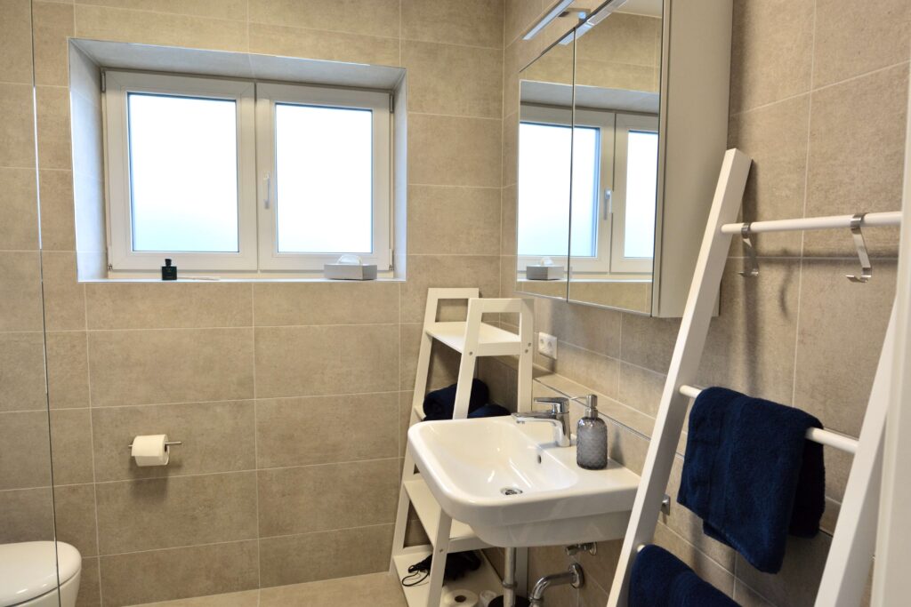 Das Badezimmer ist ebenfalls großzügig geschnitten, verfügt über ein Fenster, sowie eine ebenerdige Regendusche und bietet viel Platz für Ihre Sachen.