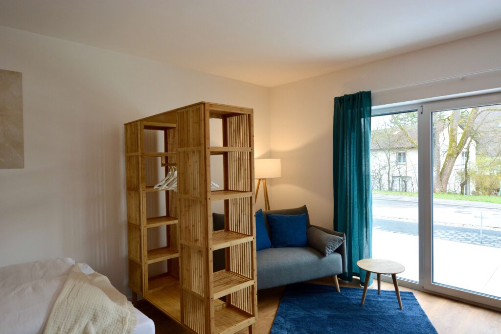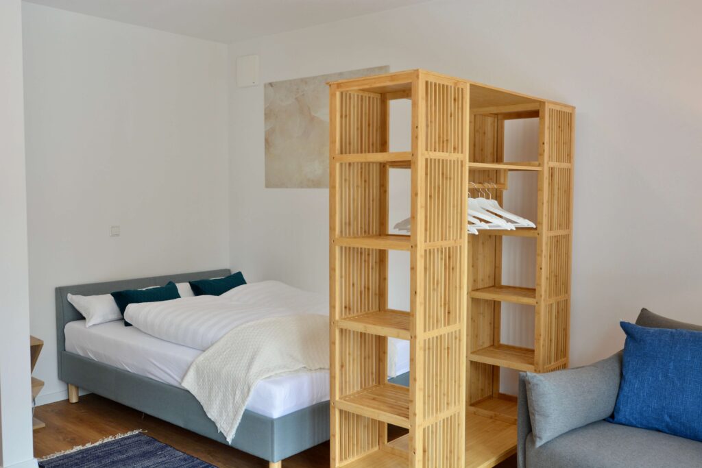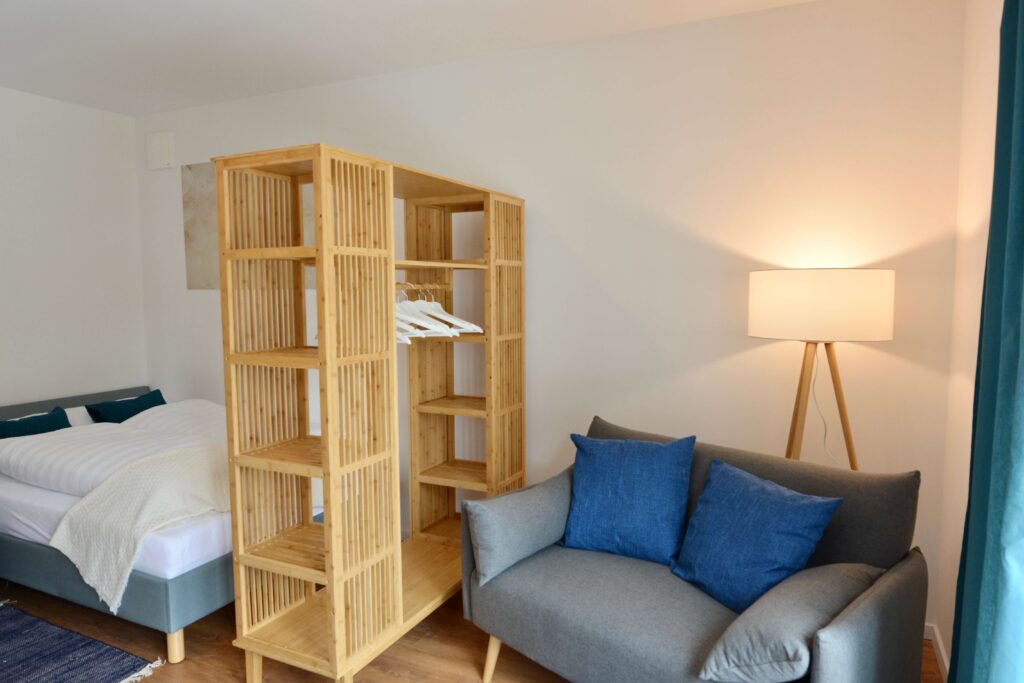 Der Wohn- und Schlafbereich ist geschickt unterteilt und bietet Platz für bis zu 2 Personen im komfortablen Bett. Ein luftiger Kleiderschrank sorgt für ausreichend Stauraum für Ihre Kleidung und persönlichen Gegenstände. Eine gemütliche Couch lädt zum Entspannen ein und am Schreibtisch mit Bildschirm können Sie bequem mit Blick nach draußen arbeiten.