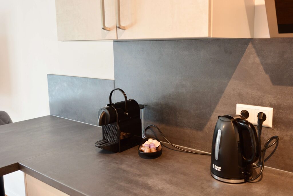 Das großzügige Apartment verfügt über einen hellen und freundlichen Flur, eine vollausgestattete Küche mit Kühlschrank, Kaffeemaschine, Geschirrspüler, Backofen, Toaster und Wasserkocher.
